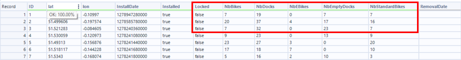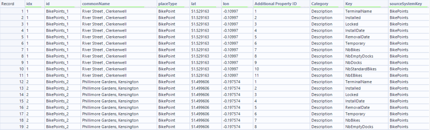 The problem here is that there are multiple lines for each bike point, each giving details about a specific metric.