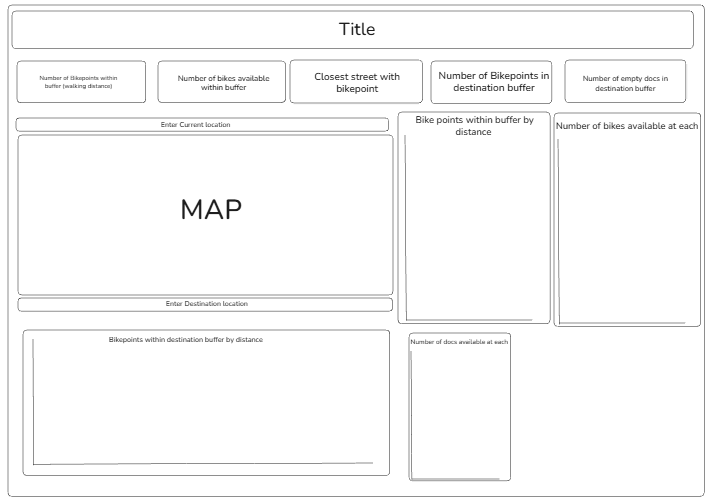 The basis behind the brief was to use Bike Point data from the TFL API to create a dashboard that would allow the user to see: