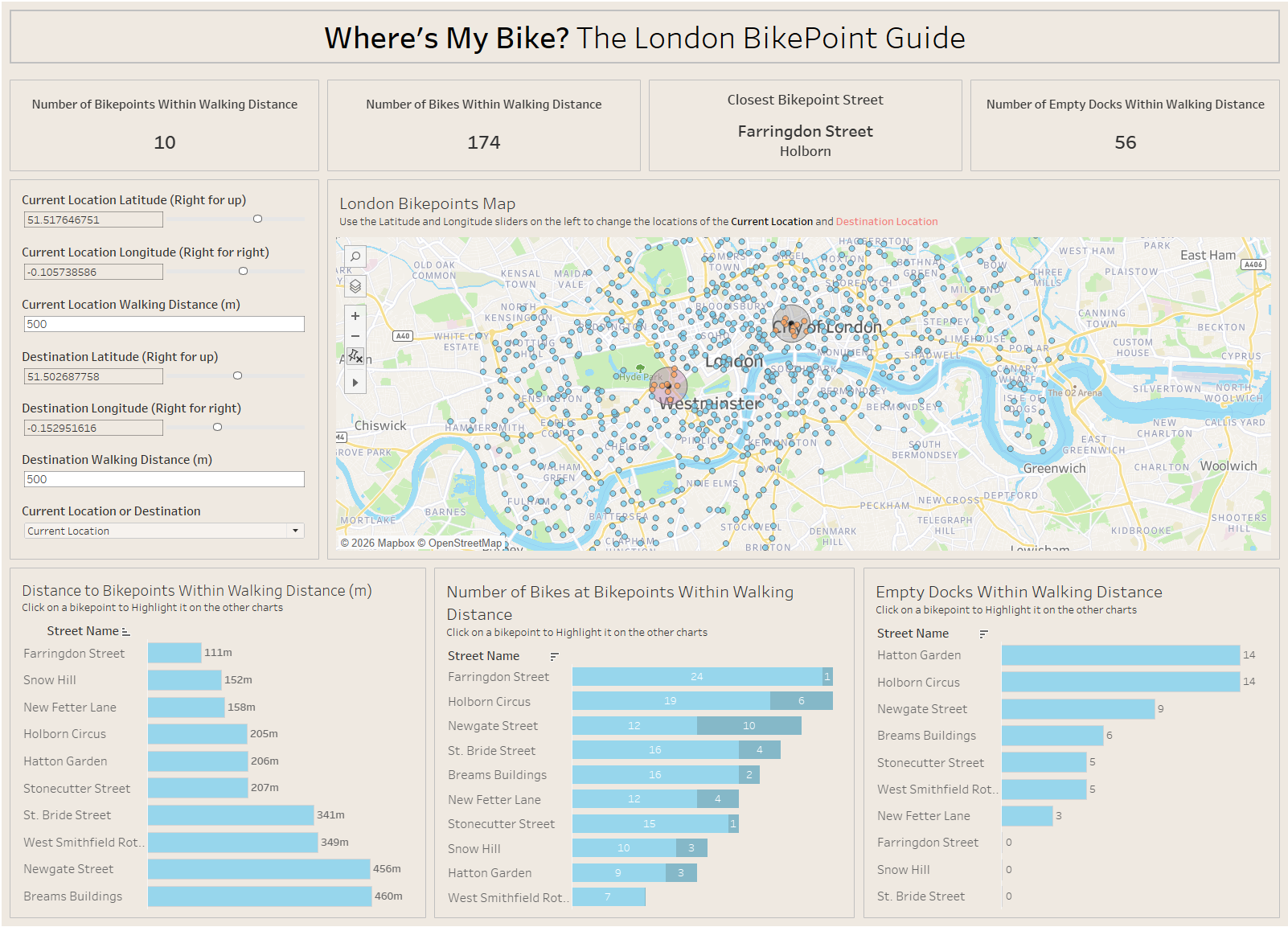 This dashboard allows the use to use the sliders for longitude and latitude to pin-point their location and destination location. Also selecting multiple points on the map changes the destination point to be in the middle of the selected points. So if the user knows they are going to a general area, they can set their destination point in that area. The user can then change the walking distance to increase or decrease the radius of the circle. This then filters the information in the charts and KPI's to only show the bike points within the radius.