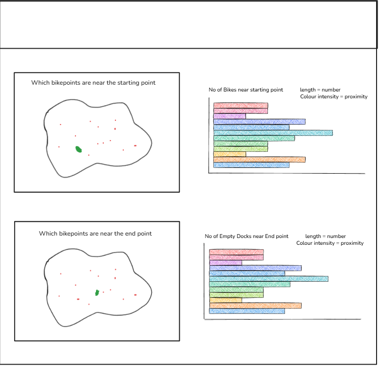 The final dashboard stayed true to my original sketch with the four core visualisations. The black dot on each map represents the user's starting or destination point with the surrounding points showing bike stations within the selected search radius, which can be adjusted using the parameter at the top. The bar charts show the top 10 nearest bike points where the bar length indicates the number of available bikes or empty docks and the color intensity represents how close each point is to the user's location.