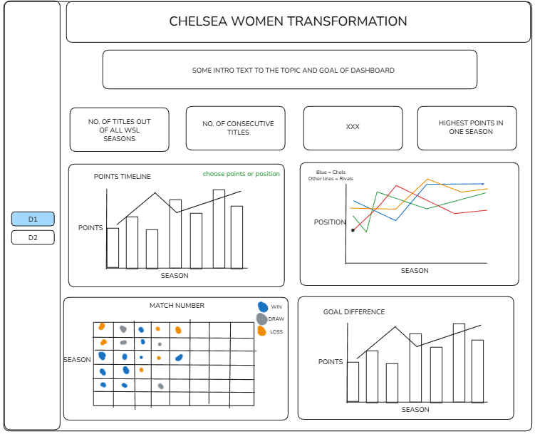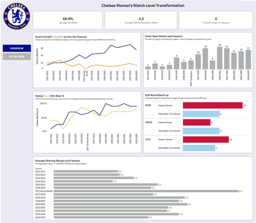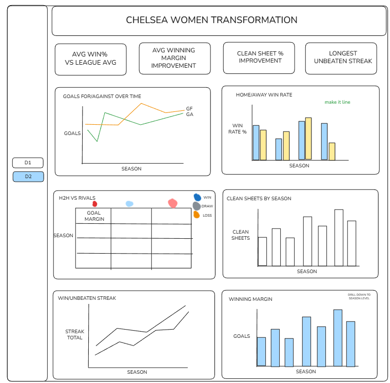 I didn’t have a tightly defined user persona in mind. The dashboards were aimed more towards someone already familiar with women’s football, with the goal of clearly visualising Chelsea’s rise and sustained success rather than introducing the league from scratch.