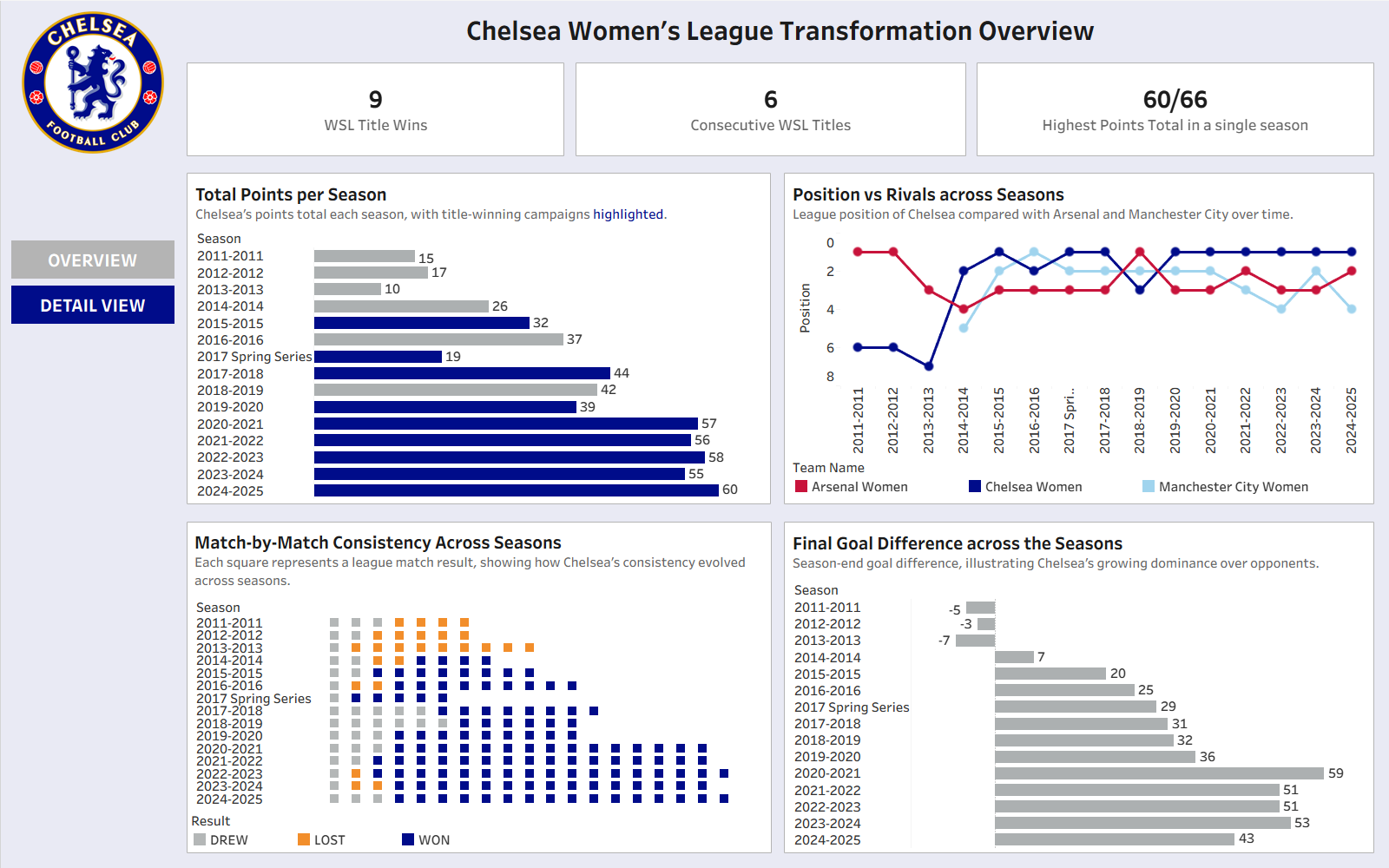 The central narrative I wanted to explore was Chelsea Women’s transformation over time. In their early WSL seasons, Chelsea were relatively mid-table and inconsistent. Over the years, they evolved into a dominant force, winning the vast majority of recent league titles and establishing themselves as one of the strongest teams in women’s football.