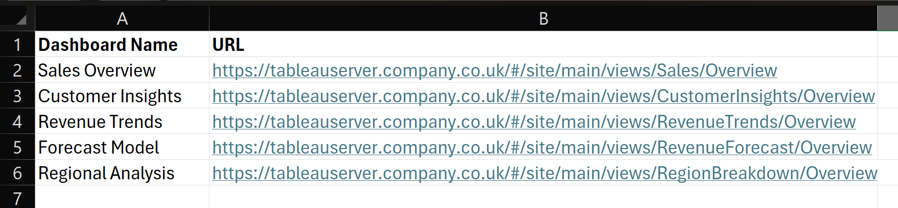 First, create the repository - this can be as simple as an Excel file stored on the server alongside the workbooks. It should contain the dashboard names (as they should display in the navigation UI) and the workbook URLs.