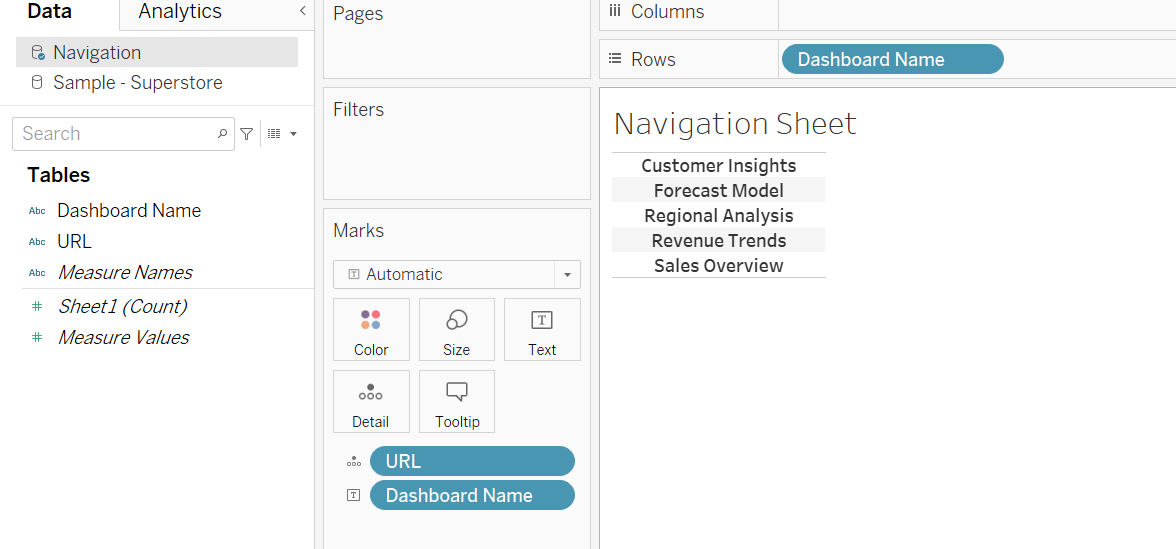In your workbooks, add this navigation repository as a new data source, then create a new sheet. This sheet will function as the navigation bar in all your dashboards, and should contain the Dashboard Name field (to display), and the URL field on detail (to feed the navigation action).
