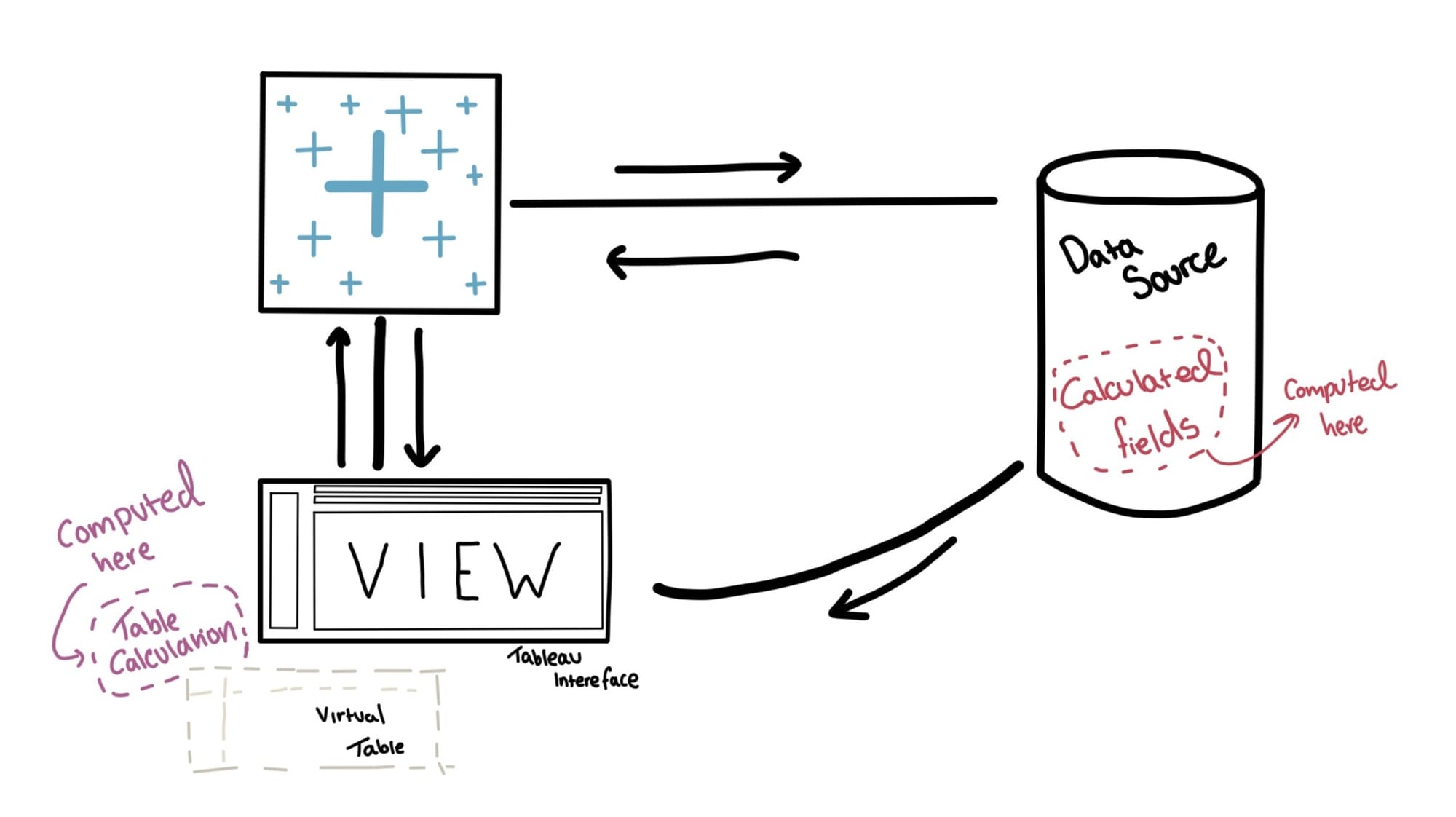 Normally, when you create a calculated field (specifically a row-level calculation), it is done at the data source level. Aggregated Calculations ( like SUM([Profit])) are processed by the database and then returned to Tableau as a single value. However, table calculations are performed at the cache level; think of it like Tableau is locally computing a calculation. This allows you to perform aggregations on data that has already been aggregated.