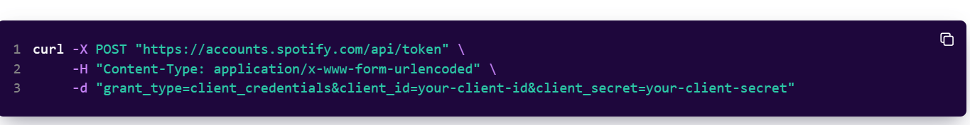 With our credentials in hand, we need to request an access token. Spotify uses the Client Credentials flow, which requires us to: