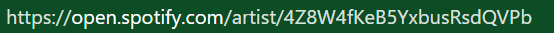 The goal of this demo is to request data on a specific artist. To do this, we need to get the Artist ID from the end of the URL of the artist's Spotify profile (e.g., for Radiohead: 4Z8W4fKeB5YxbusRsdQVPb).