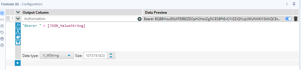 Now we need to format the Authorisation header so it matches the format of the curl command in the API documentation. We do this using the Formula tool to create a new field called 'Authorization' with the formula: "Bearer" + [JSON_ValueString]