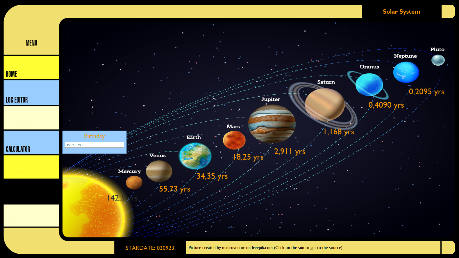 In this project we had to scrape a webpage and create a dashboard afterwards. In my case I had to get data about planets and as a little Trekkie I came across with a more creative approach. But it's not only the design, you can calculate your age for each planet as well.