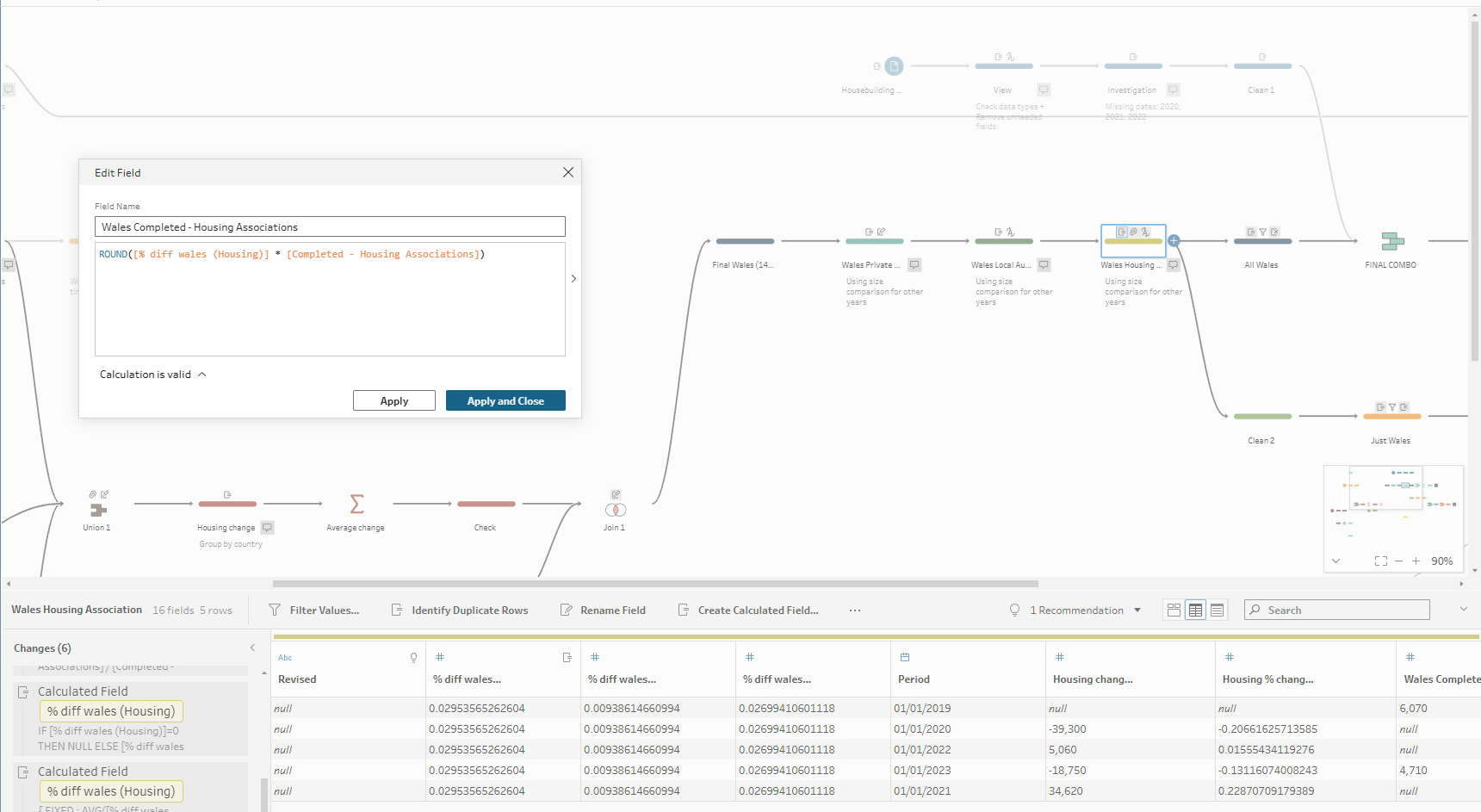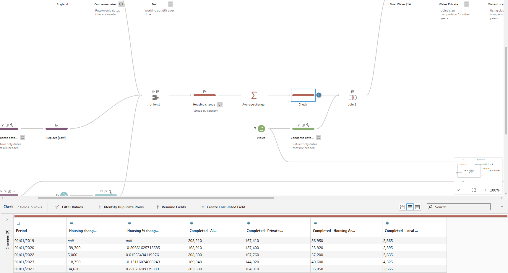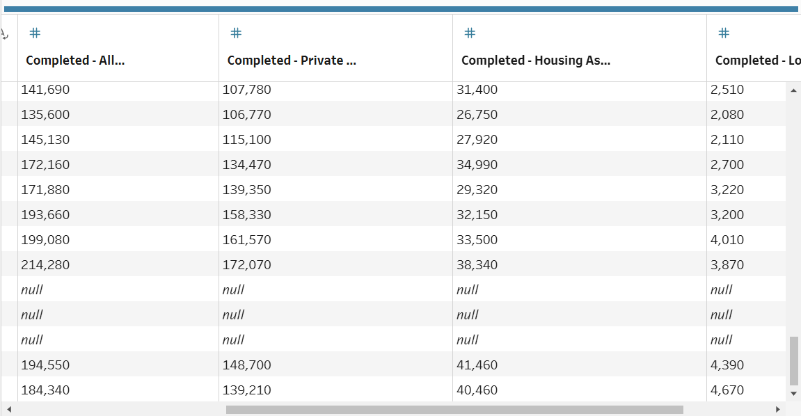 When I started cleaning the housebuilding dataset I realised there were three rows of nulls in the data fields I wanted for the final dashboard. After some digging, I found that these were from the Wales dataset where the numbers weren’t available for those years (probably due to COVID).