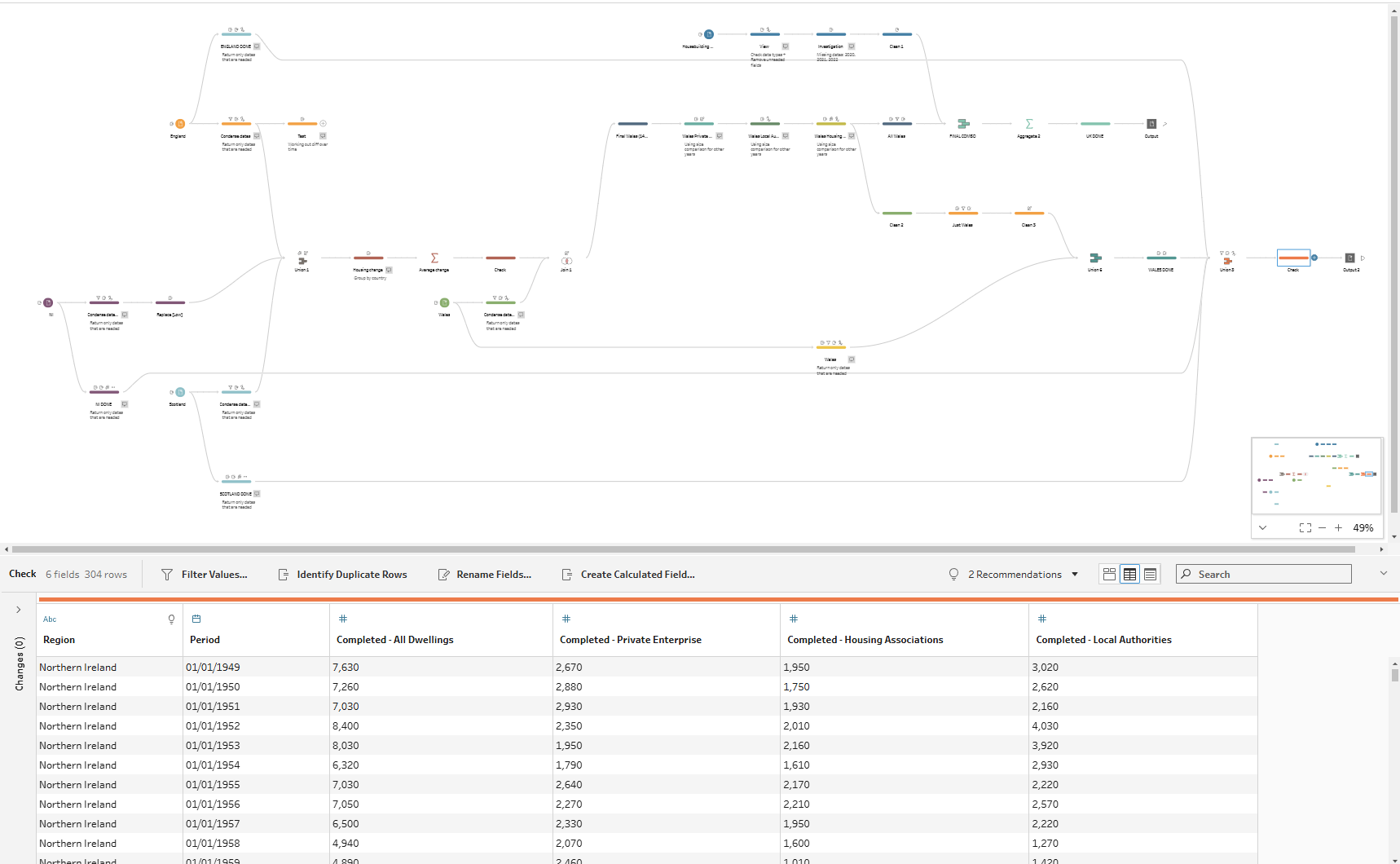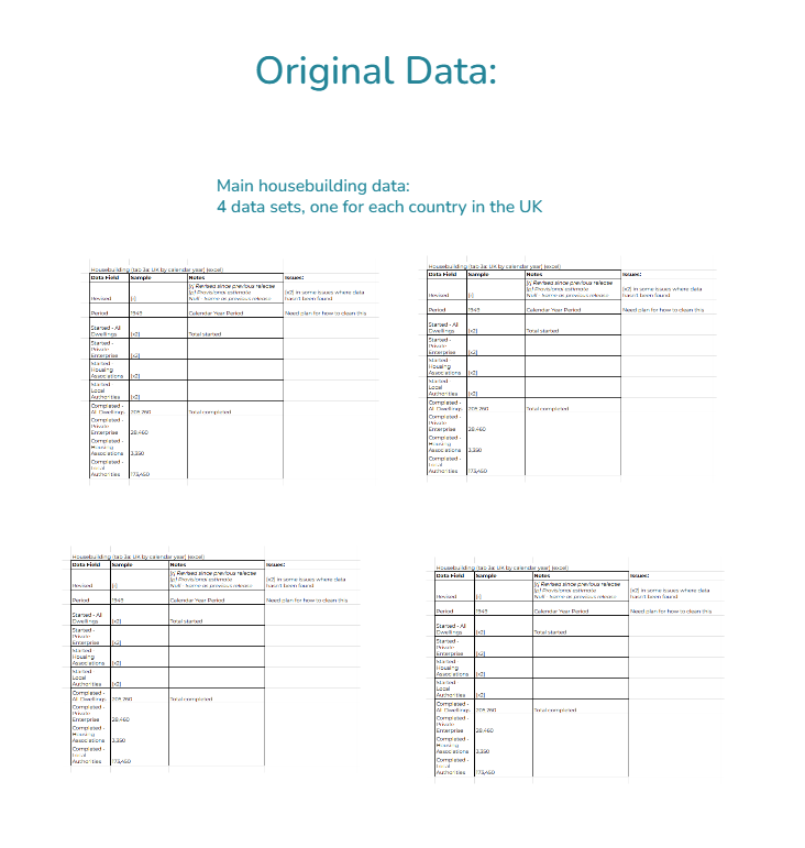 Continuing with this project, I now needed to clean the original data using Tableau Prep. Originally I had an excel file with four sheets of housebuilding data - one for each country in the UK. I started by looking at the structure of these and identifying any key issues: