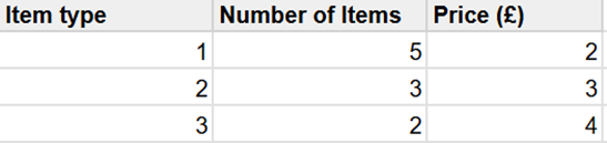 For example, say you buy 5 items that are £2 each, 3 items that are £3 each and 2 items that are £4 each. Your dataset will look something like this:
