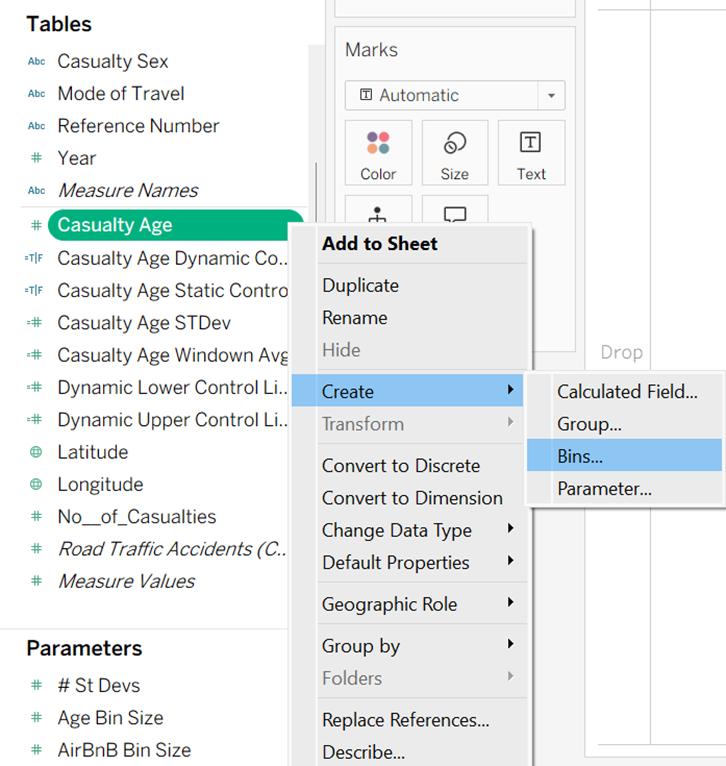 To make a histogram in Tableau, start by creating bins of equal size. The size of the Bin is the number of values in each one, and this can either be set as a fixed size, or be set as a parameter.