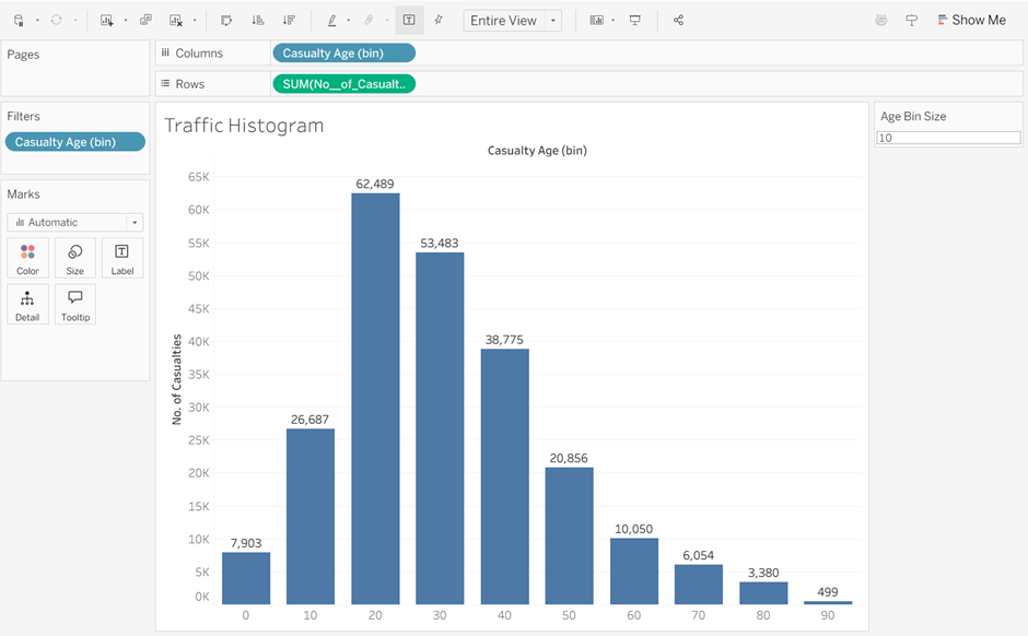 Once the Bins have been made as a new field, the histogram can be built in the worksheet using the Bin for the columns and the numerical field as the rows.