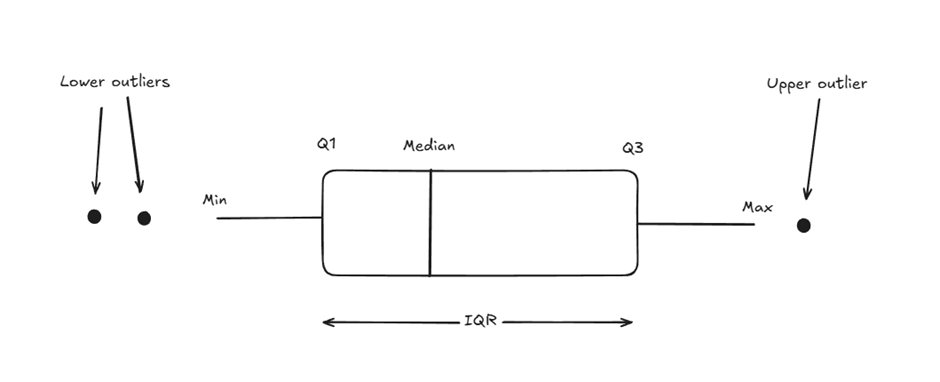 So if the IQR is the middle 50% of the data, the minimum and maximum show where the full 100% of values should theoretically fall. Therefore, anything outside of these are outliers.