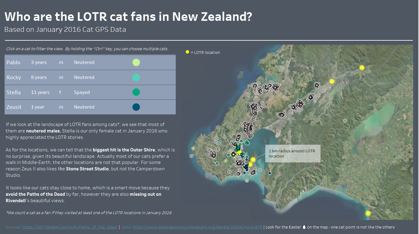 Some thoughts on our first day in Dashboarding Week. Our job was to work with cat tracking data and create a dashboard. We had GPS and "demographic" data about cats' whereabouts, routes, gender, age, etc. in the US, UK and New Zealand. I chose to work with New Zealand cats as I thought it would be cool to add an external data source - some Lord of the Ring locations and play around with that a little bit.