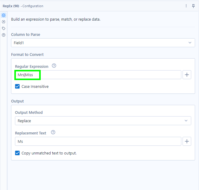 - Replace: Replaces a given expression with a string of your choice. To replace the 'Miss' and 'Mrs' in Field1 with 'Ms,' we can enter the following: