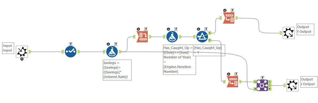 Similar to WHILE loops, the macro will run up until the point that a predetermined criteria is met or alternatively the maximum iterations are met. In this example the macro runs until Joss' total invest exceeds the value of Chris' investment. Each individual's investment has a different starting value, with the lower value having a higher interest rate than the other. The one output will tell us how many iterations (years) it took for this inflexion point to occur, and the other will show the absolute investment value output
