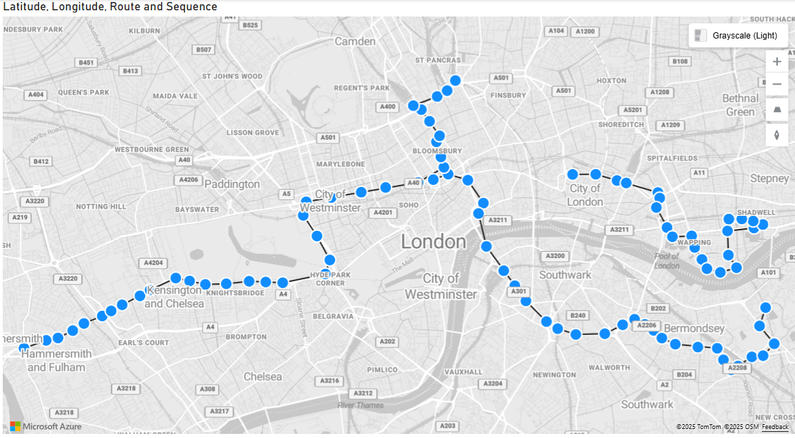 Using the Azure graph, we can use Latitude and Longitude, as well as a Route column and sequence field (that orders each stop along the route), we are able to visualise the different bus routes in London. On top of this, it maps each of the stops the bus makes along its journey.