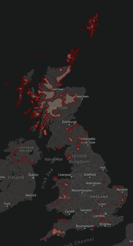 The software gives you the chance to make some interesting, very specific map types which can be rather useful for analysis. The map below visualises areas in the UK that do not have 5G coverage available. Some of the tools such as Create Points takes latitude and longitude to map out points, which the Poly-Build tool can then use to create shapes from. After aggregating, it's possible to use the Spatial Process tool to remove polygon areas from each other, to then create the map.