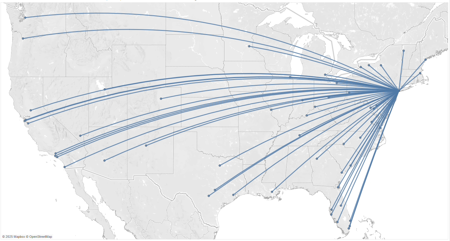 I remember seeing DS51 present a map that showed the flight paths of different journeys and being in awe. Turns out, it's not too difficult to make! Using latitude and longitude of US airports, and the MakeLine and Length functions, you can visualise the fight paths (in this case) for all flights originating from JFK to the rest of the US.