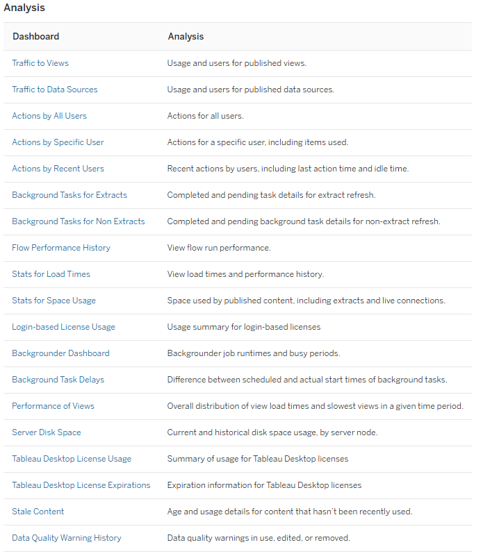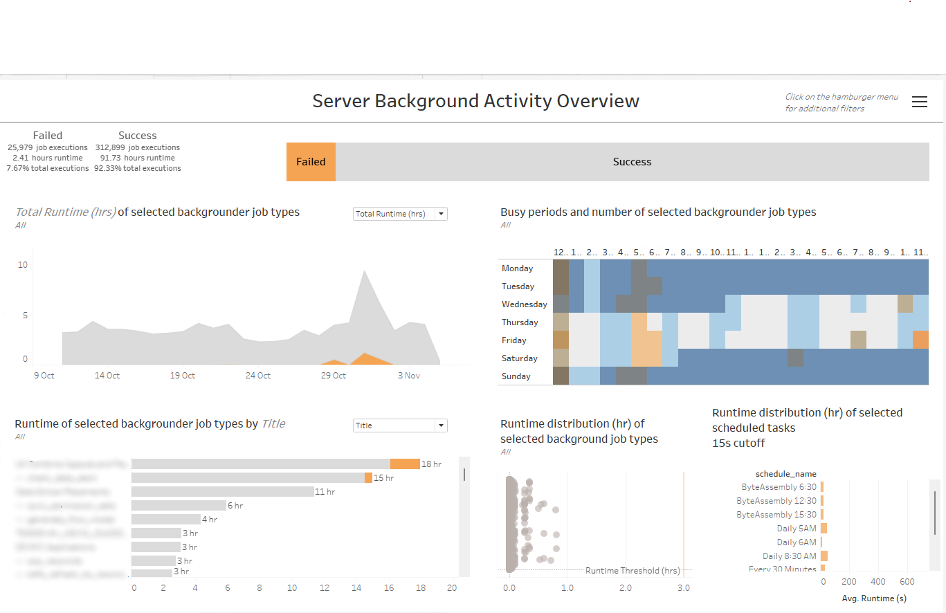The repository holds information relating to user statistics, about what people are clicking on and where, which dashboard is accessed, how often, and by who. If you navigate on Tableau Server to all sites, then to the Server Status tab, you can scroll to see some of the Tableau native metric dashboards. I used the the background tasks dashboard as inspiration to adjust some of the metrics and include a runtime distribution chart for schedules tasks.