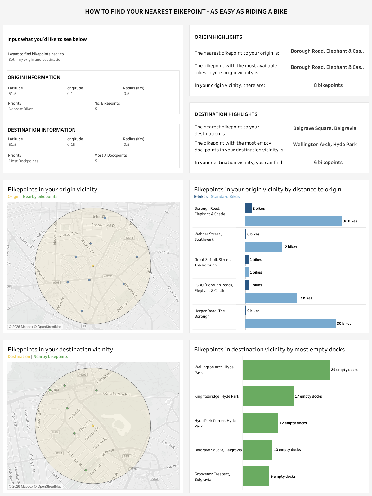 Before starting to prepare charts to go into my dashboard, I sketched things out briefly to work out what I wanted to show and how. As Serena had been quite clear in the questions that needed to be answered, I had a good foundation in what to show. Then I considered a couple of additional points that I felt would be of interest to the user as well, such as prioritising a nearby location over a location with more bikes should they choose to do so. After re-familiarising myself with spatial calculations in Tableau, I got stuck in. Everything again went fairly smoothly after that, bar a few minor hiccups like using the wrong calculated field in a calculation by accident. Nothing too crazy to note!
