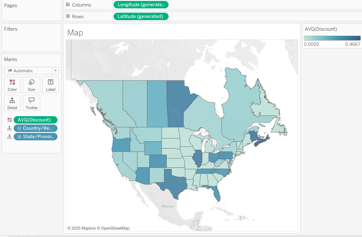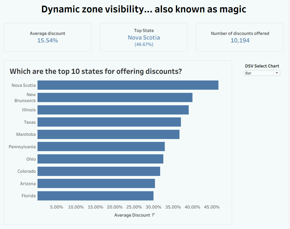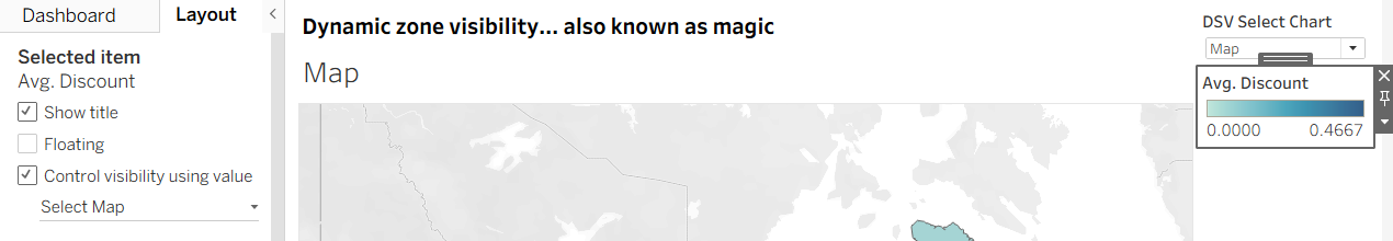 Step 1: Create your charts. In this instance, I am creating example charts so they are not the prettiest but they do the job. I've created a bar chart and a map with average discount as the measure and state/province as my dimension.