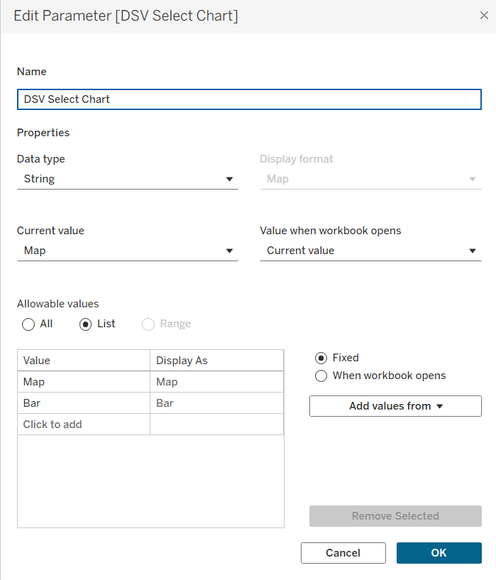 Step 3: Create your parameter. This parameter will act as your chart selector so add the appropriate names for whatever you're showing. Fill out the rest of the parameter as I've completed in the screenshot below.