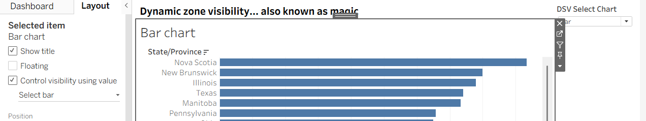 Step 5: Create the dynamic zone visibility. Return to your dashboard and select show parameter from the drop down in the corner of one of your charts. Then on that chart, go to the layout pane and choose control visibility using value. Choose the appropriate value for both charts and magically one will disappear. You can then use your parameter to switch between views.