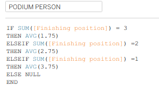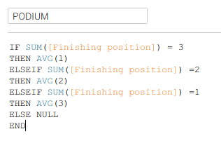 Step 4: Adding your 1st, 2nd, 3rd place finishers on top of the podium. Currently your player/team can be found at the bottom of your podium blocks but you might want, as I did, to have them on top of the podium like they would be if standing on a podium in real life. You can add the name to label and align it at the top but again, it didn't fit my vision of the podium so some extra work began. This started with creating a new calculated field which fixed the position of the finisher against the podium they would be standing on. See the calculation below for an example of what to write. The exact values which will go into your averages can be slightly amended depending on the space that your podium will be taking up in your dashboard, thus impacting the spacing of the y axis on your chart and the gap between your podium block and your finisher.
