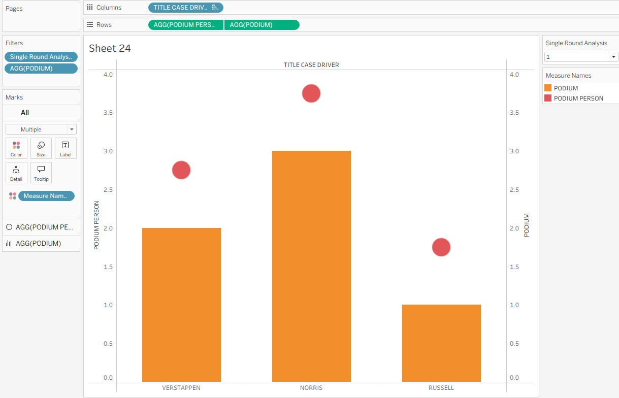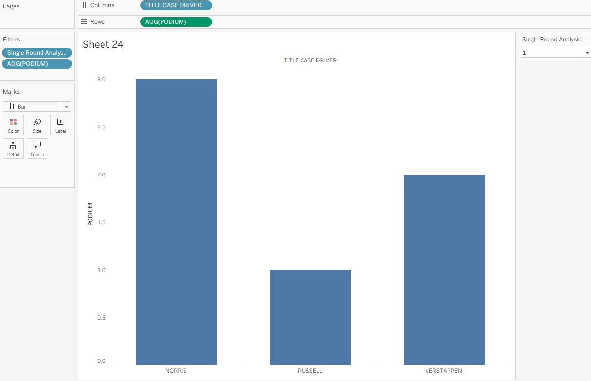 Step 2: Start creating your chart. So you could do this at the end after all your calculations are created but I personally think it's easier to see what you're doing and understand the reasoning behind your calculations by looking at it step by step. If you have multiple rounds you're looking across like me, begin by dragging your round field onto filters and selecting one round. Then drag your podium block calculation onto rows and your player/team (or in my case, driver) onto columns. Unless you only have top 3 finishers in your dataset, you'll need to filter for nulls. If it's still not looking quite right, check that your marks are set as bars and your podium calculation is set to continuous (green) in rows. It should look similar to what I have below.