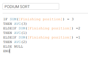 Step 3: Ordering your podium blocks. You can see the bare bones of your podium coming together now but if you want it to be truly representative of a real life podium, you'll recognise that the blocks are in the wrong order. You might have been lucky and coincidentally your blocks are in the right order, that'll be because of the alphabetical order of your columns dimension. It is highly unlikely that for all of your rounds this will be the case, so we need to fix the sort. Start by creating the calculation below which is essentially saying your 2nd place block needs to be on the left, 1st place in the middle and 3rd place on the right based on the ascending average values.
