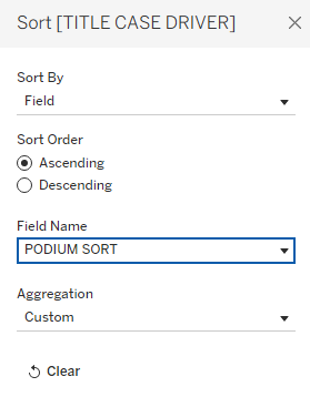 Then go to your column dimension (your team/player etc.) and right click > sort. You want to sort by field, choosing your 'podium sort' calculation and ascending. You should see your chart change in the background to the correct formatting.