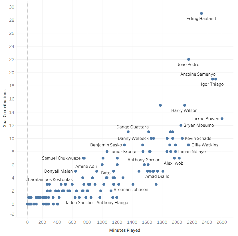 I then built a scatterplot with minutes played on the x axis and goal contributions on the y axis. To keep it focused, I filtered it to Premier League only, excluded goalkeepers, and only looked at matches from the start of the current league season. That gave me a decent first view straight away. The players with the biggest output over large minutes stood out quickly, while the labels also made it easier to pick out players doing well with less game time.