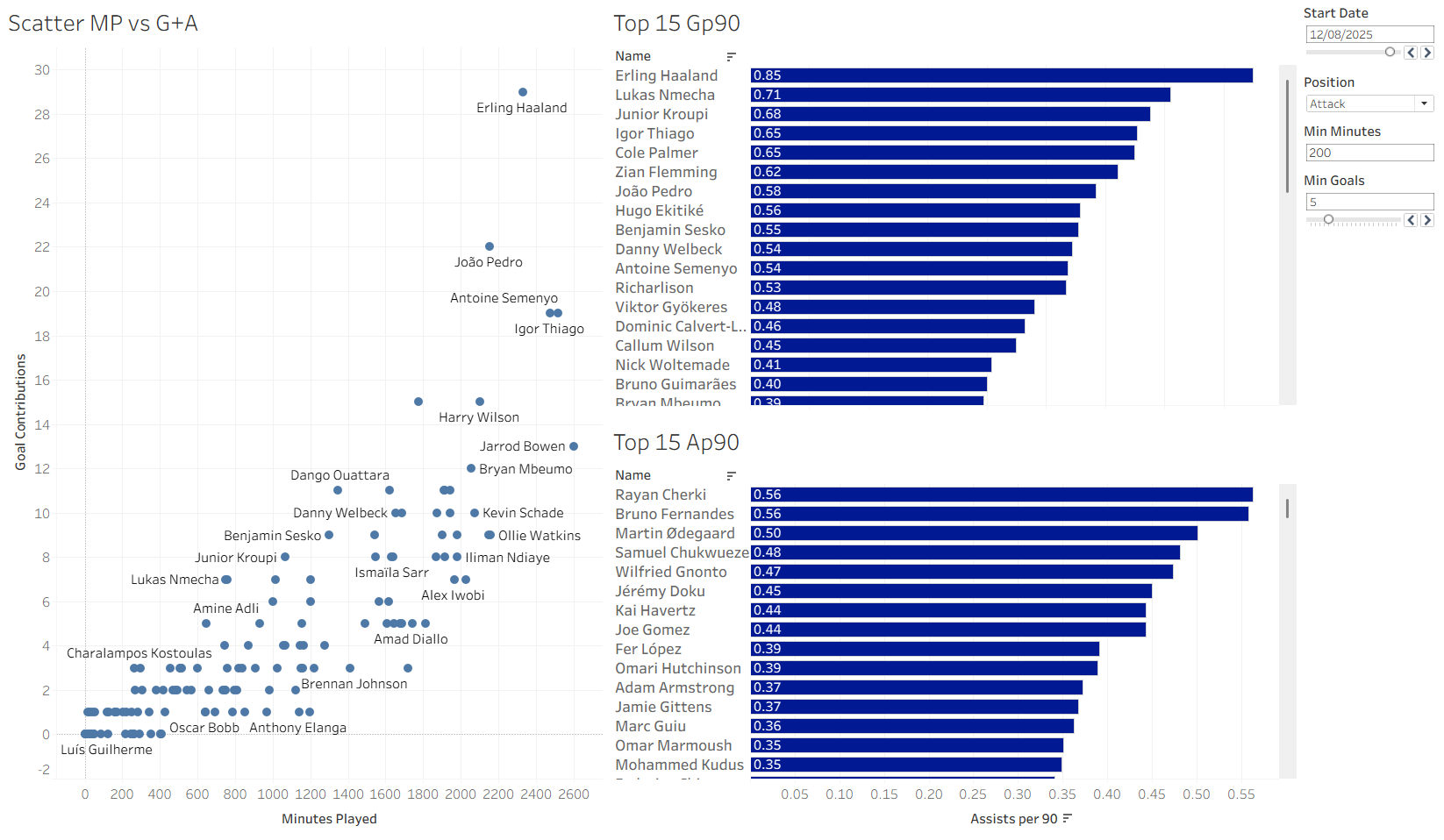 I started with a scatterplot of minutes played against goal contributions, then added top 15 charts for goals per 90 and assists per 90. After that, I added parameters so the user can filter by minimum minutes played, minimum goals scored, start date, and position.