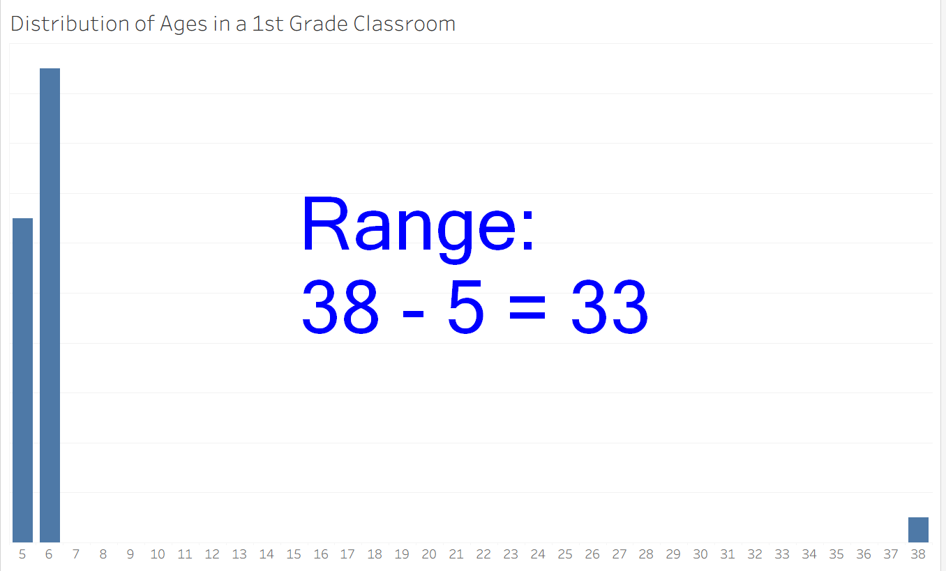 The simplest possible measure of spread is range, which is calculated by taking maximum value in a dataset and subtracting the minimum value. For example, in the dataset [1, 2, 3, 4, 5, 6, 7, 8, 9, 10], the range is 10 - 1, or 9. Range works well for condensed datasets without outliers. When there are outliers present, there is a risk of creating a false perception when using range to measure spread. For an example, consider the distribution of ages in a 1st grade classroom. In this artificial dataset, we have 13 five year old students, 19 six year old students, and a 38 year old teacher. From looking at it, I can tell this data is dense, with very little spread. However, using range to quantify spread gives the illusion of a much greater spread than there really is. After all, spread is primarily interested in the center of the dataset (what "most" of the data seems to do). The typical fix for this is to try to use a measure called Interquartile Range.