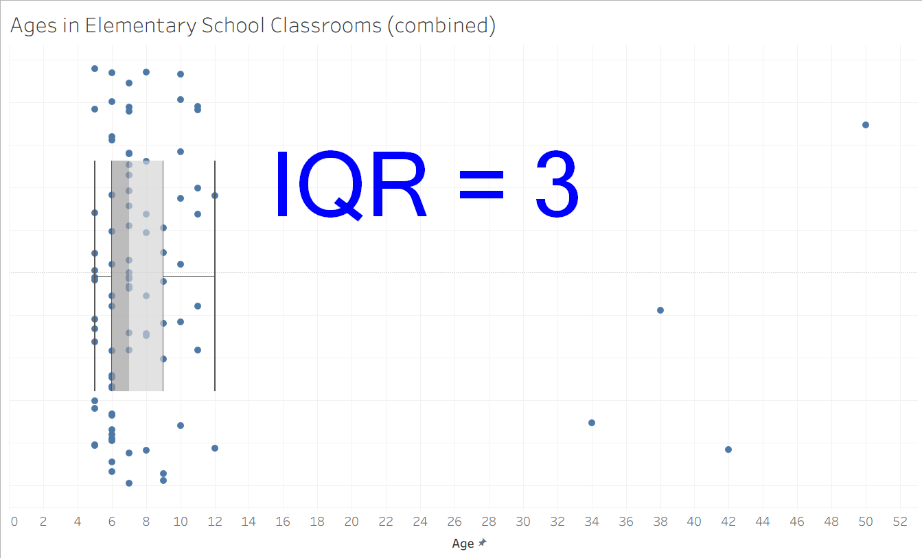 In this next example, I have mocked up some data from a larger elementary school ages dataset, including 88 students and 4 teachers across 4 classrooms. The ages are mostly clustered between 5 and 10, with the few outliers of the teachers' ages skewed towards the right. Fortunately, the box-plot framework is not overly influenced by these outliers, finding the 1st quartile to be 6, the 3rd quartile to be 9, and the IQR to be 3. This seems to be reflective of the general behavior of the data and works much better than range (which would be 45 here).