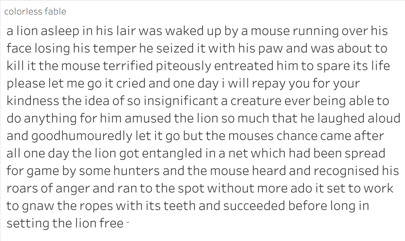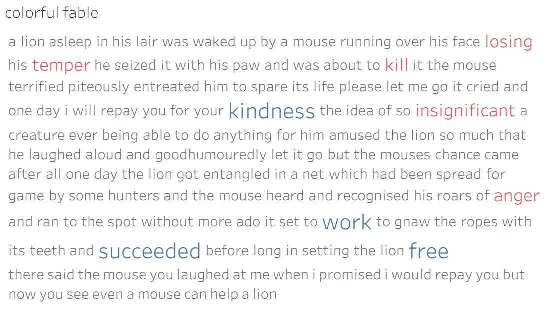 After extracting the output from Tableau Prep into Tableau, everything was ready to be plotted. To look at only one of the fables, I filtered by a single title, for this example "The Lion and the Mouse". Next, I ordered the words from this fable using their index, then plotted each word as a text mark, giving us the original text in a single color.