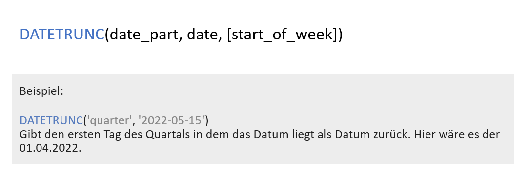 6. DATETRUNC - Schneidet das angegebene Datum auf die angegebene Genauigkeit zu.
