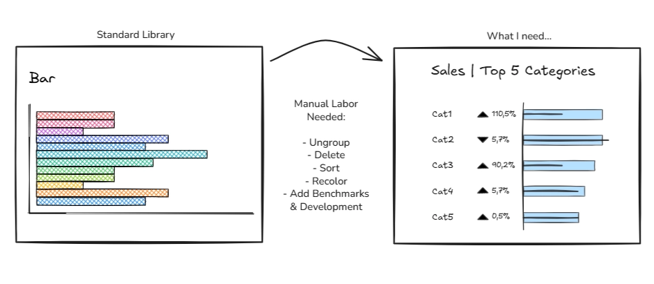 However, sketching a dashboard with the standard chart libraries wasn't easy. While there are plenty of exotic charts, foundational elements like a simple bar chart only come in a few variations, usually as unsorted, rainbow-colored shapes. Turning those into a professional 'Top 5 Ranking with a Last Year Benchmark' requires many adjustments.