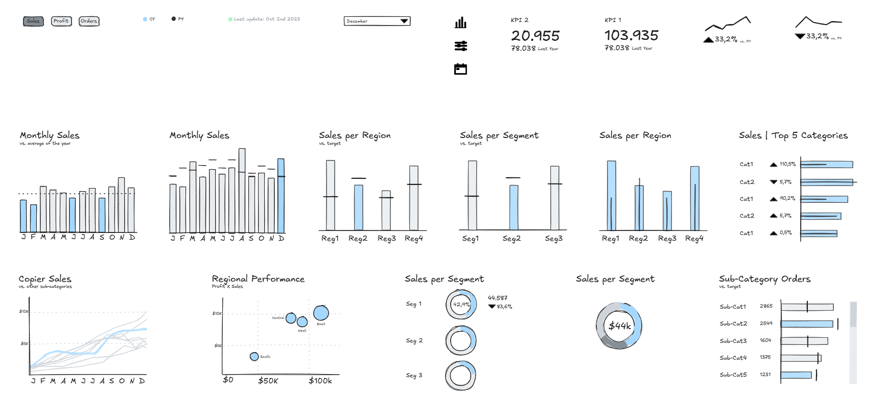 In our first week at The Data School, we learned to use Excalidraw to wireframe dashboards. Sketching is a great way to align on a vision with the team and stakeholders early on, long before we start building anything in Tableau.