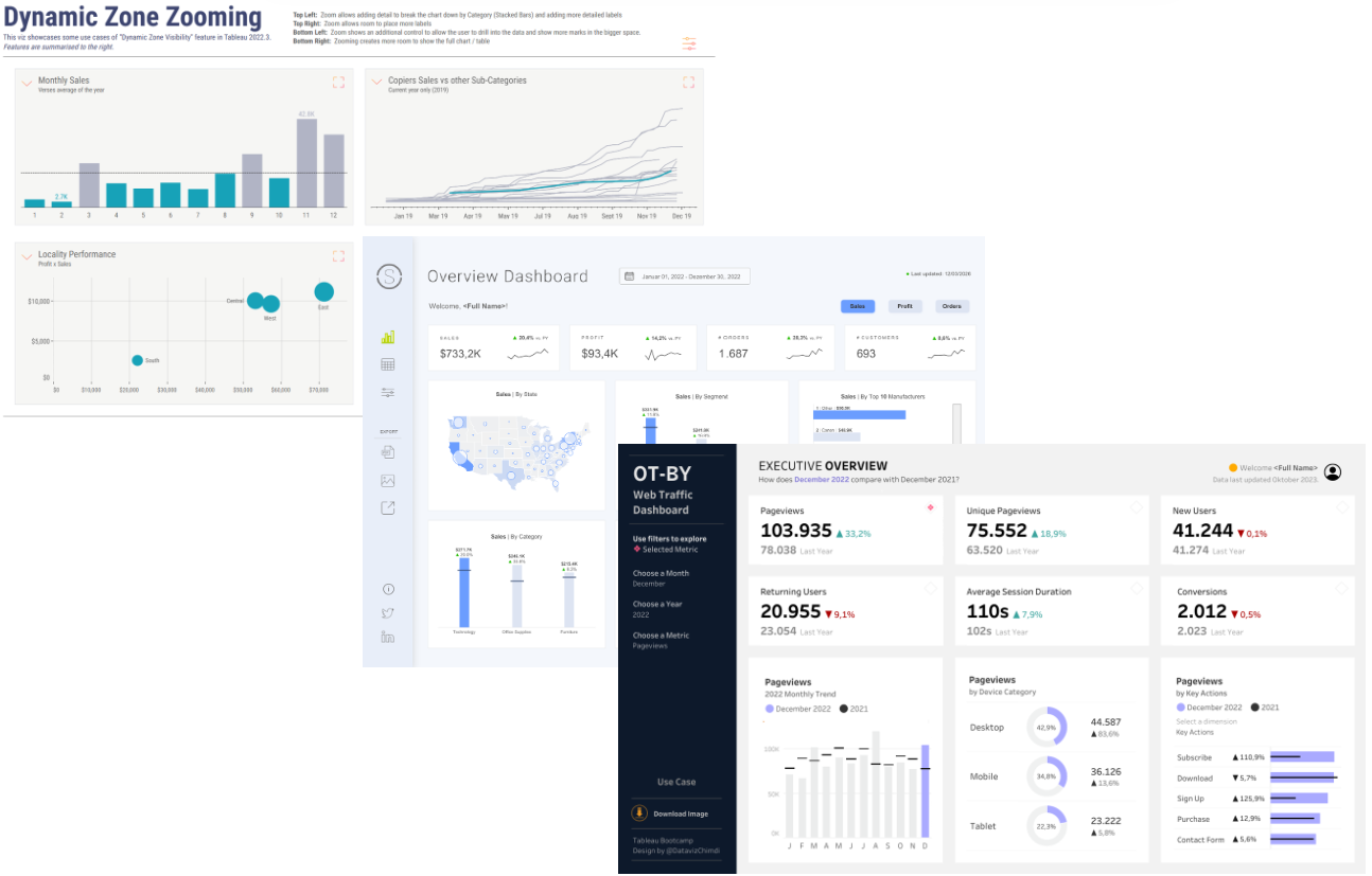 I had an idea of what I wanted, but it’s always good to look at inspiration from those we look up to. I picked three dashboards from Tableau Public that feature standard charts and essential BI components: