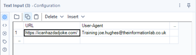 We start by introducing a text input tool containing the endpoint for the API. For this example, I will be using https://icanhazdadjoke.com/ to return a random dad joke. In this case, the documentation specifies that I also need to include a User-Agent header to help monitor the usage of this API.