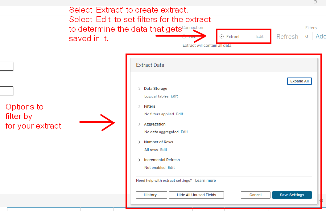 The 'Extract Filters' are the first part of this pipeline. In this stage, we can implement an extract, which is a static copy of the data that we are connected to. At this point, we may choose to filter this data, and the results will define the size of our extract.