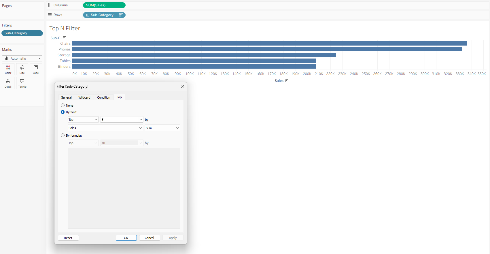 Here are the Top 5 sub-categories by sales. The blue filter labeled 'Sub-Category' in the filters pane is a top N filter. This filter comes into play after context filters, but before dimension filters.