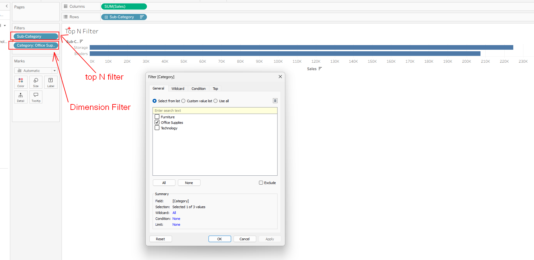 If we want to see Top 5 sub-categories in 'Office Supplies', we need to get that list of sub-categories before carrying out the top N filter.