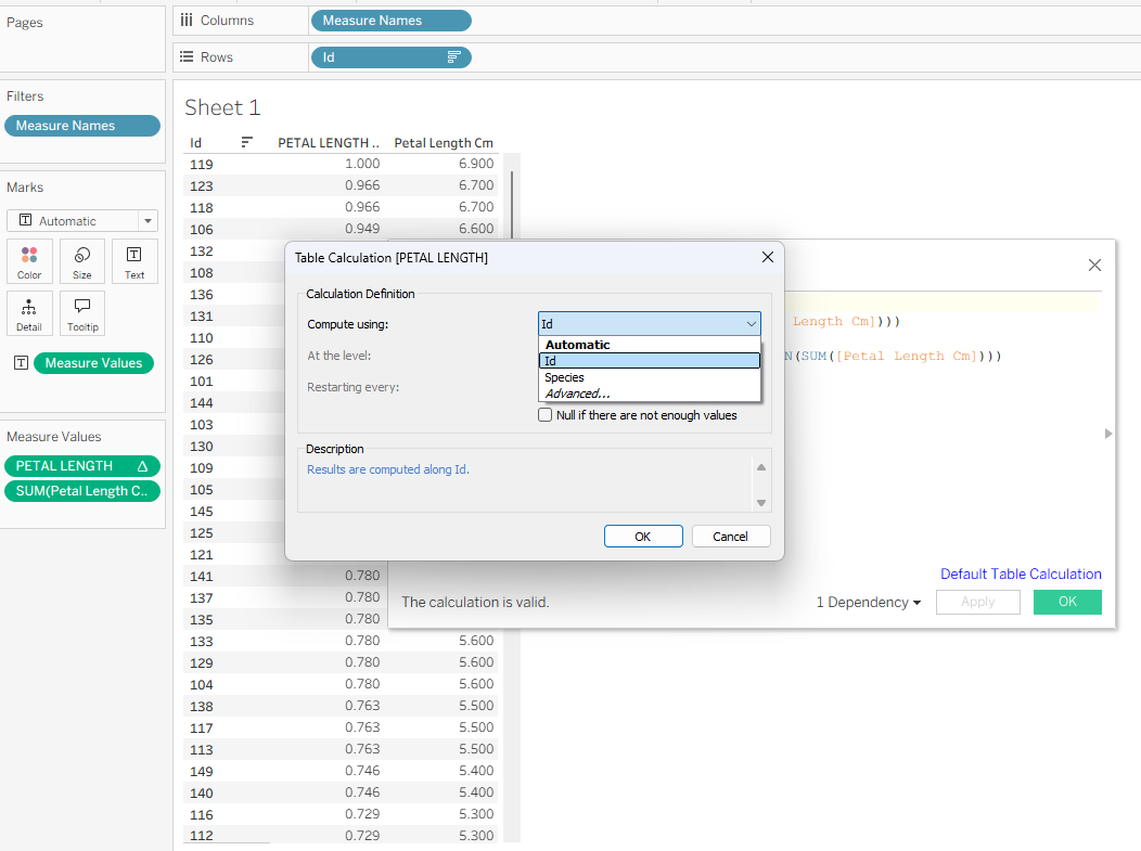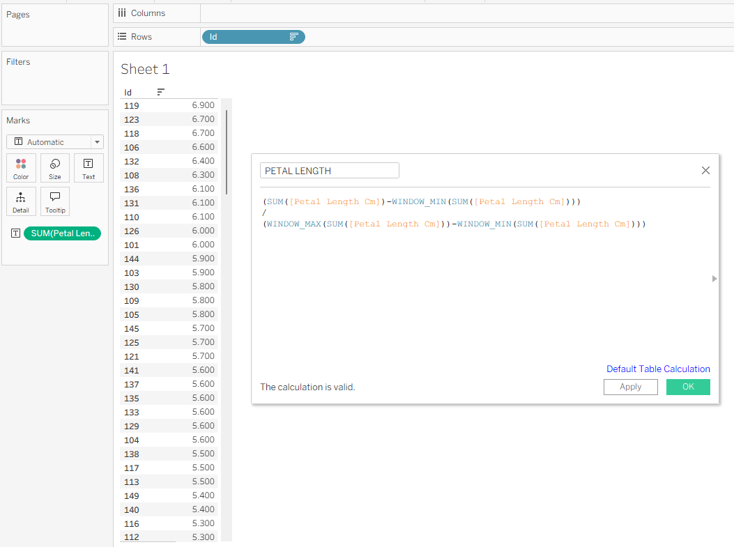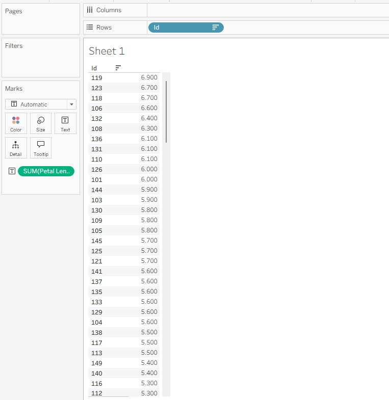 Let’s start by setting up a base table to check our core table calculation. Drag ID onto Rows, then drag our first variable—Petal Length Cm—onto Text. Finally, sort the table in descending order by petal length.