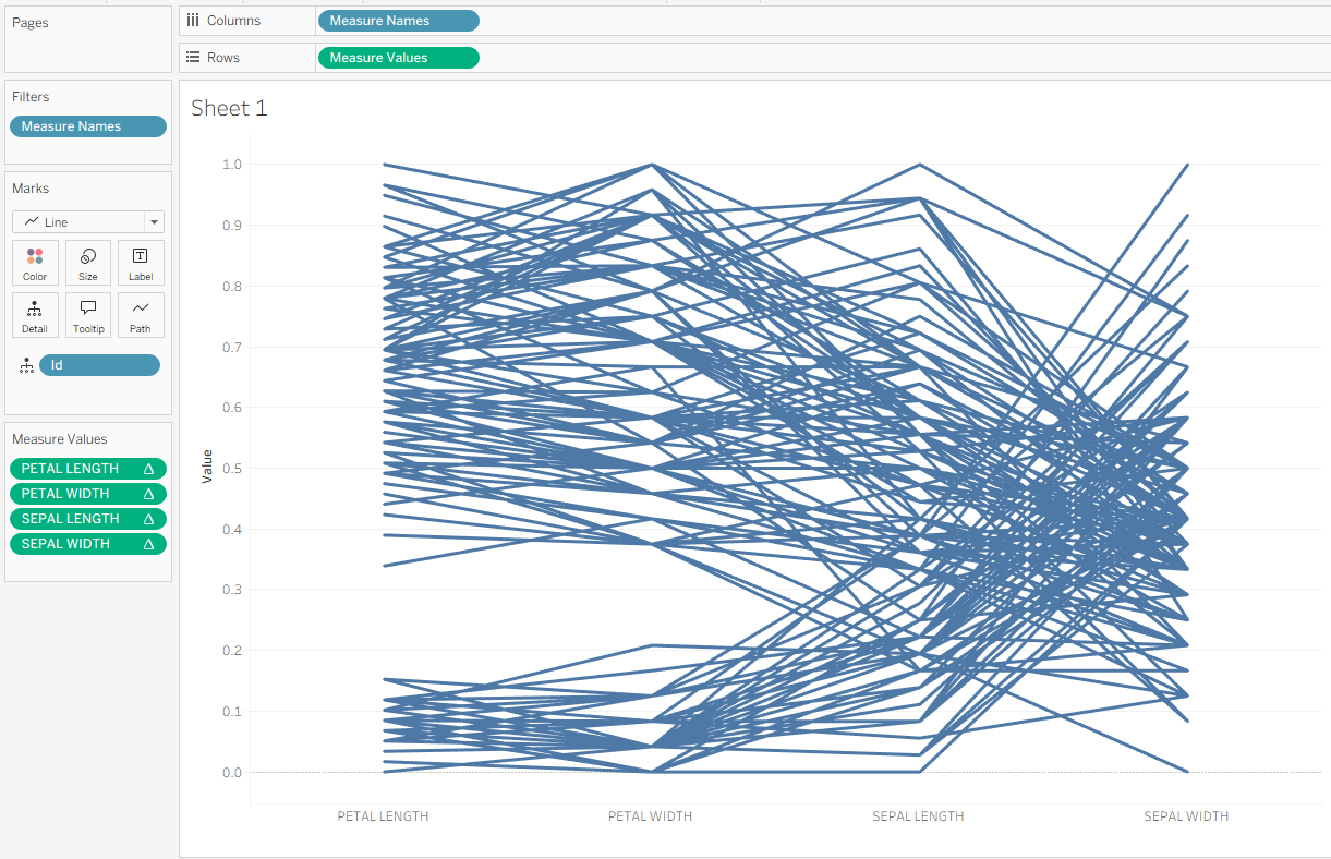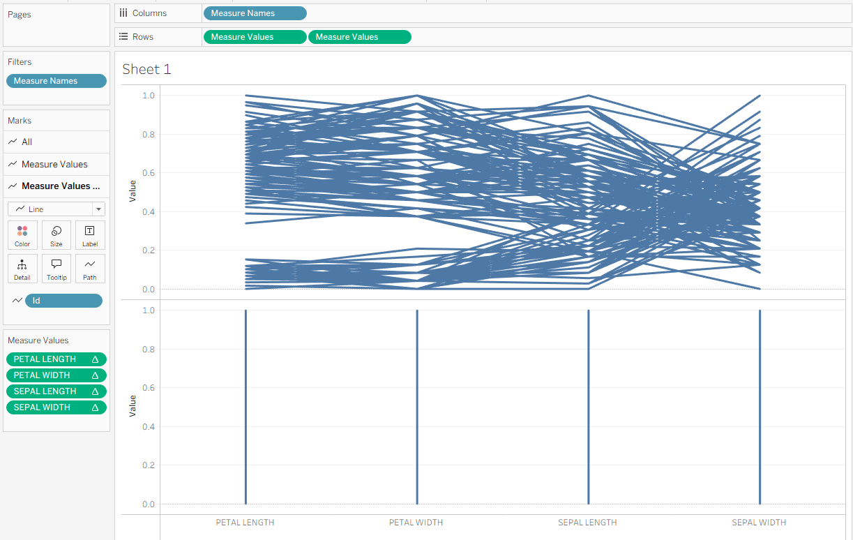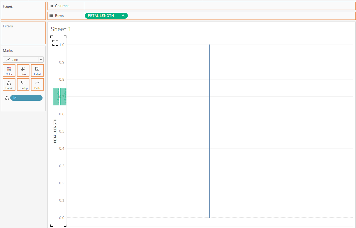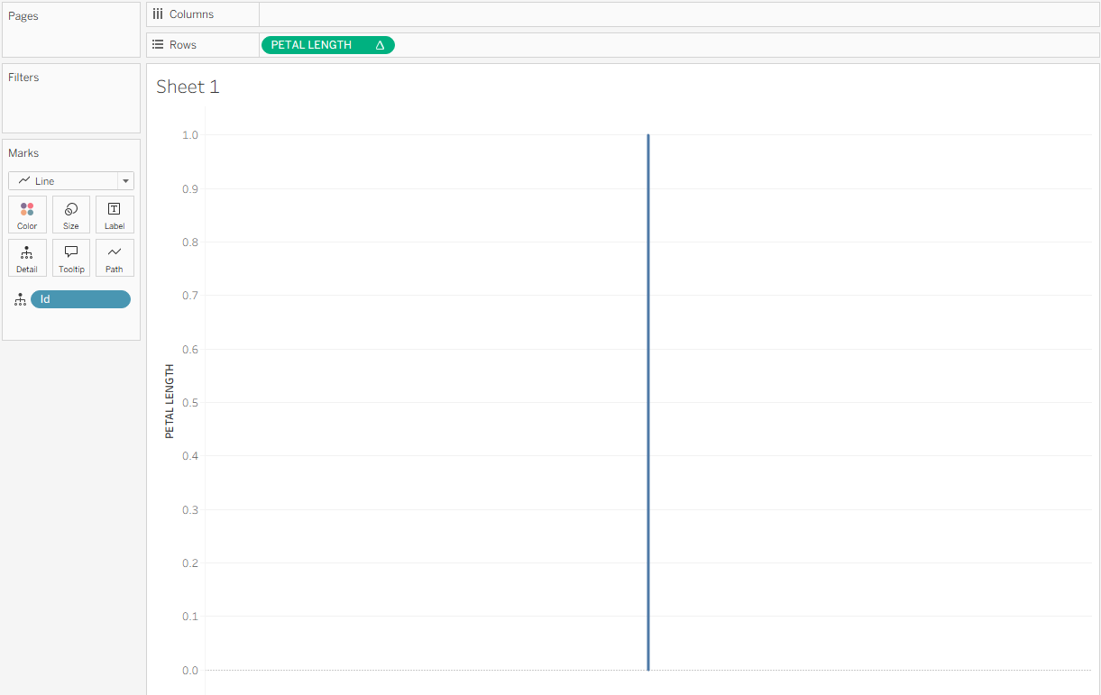 Now that the calculations are ready, we can start building the chart. Clear your sheet, then drag ID to Detail and Petal Length to Rows. You should see a single line running from 0 to 1.