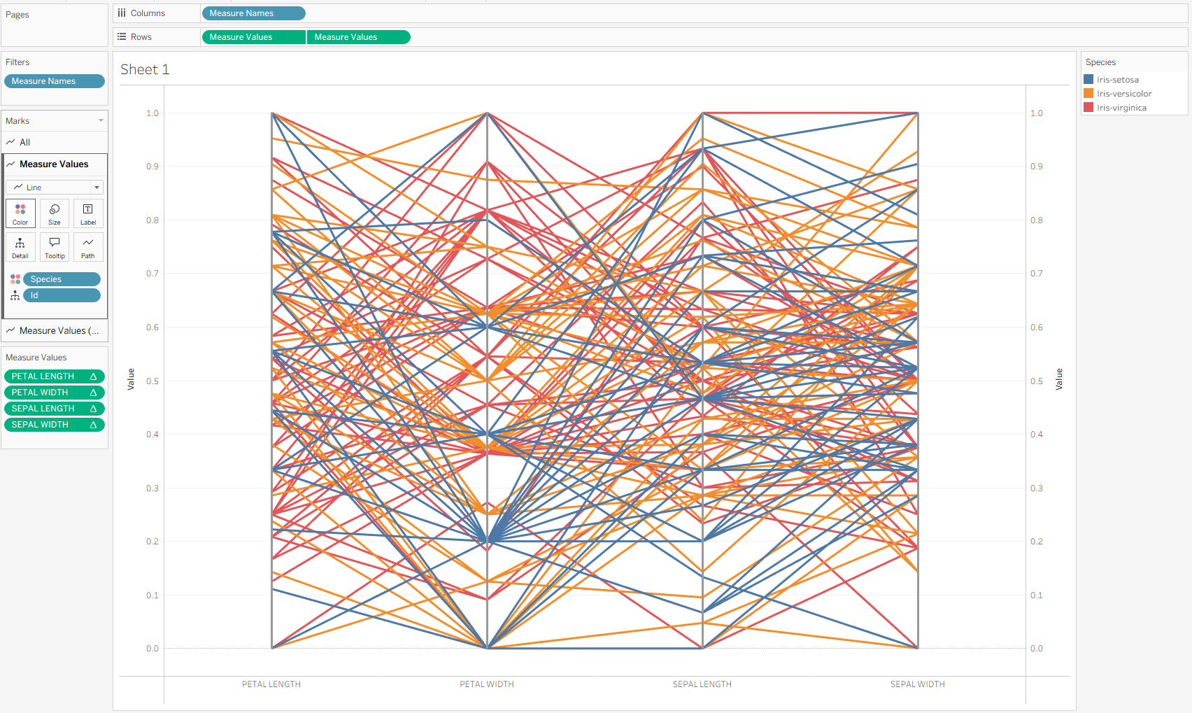 This forms the base of your parallel coordinates chart! To add visual clarity, we can draw lines connecting the values for each metric. Hold Control, then click and drag the Measure Values pill on Rows to the right to create a duplicate Measure Values (2) pill. On the Measure Values (2) Marks card, drag ID from Detail to Path. This will create one vertical line connecting the measures for each item.